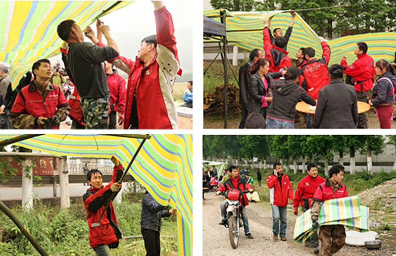 4月22日早上,全體救護隊員集體趕往帳篷物資購買地購買物資。購買了10包彩條布(每包50米),雨衣、紙巾等災(zāi)區(qū)必備物資。此后,車隊沿著雅安到蘆山縣城一線,開始挨村搜索,專門給災(zāi)民撘?guī)づ?。說是帳篷,其實就是用油布做頂,就地取材做支架為災(zāi)民搭建臨時的家。這是經(jīng)濟又實在的做法,災(zāi)民在這樣的帳篷下,可以居住,也可以燒火做飯,比真正的救災(zāi)帳篷要實用得多。