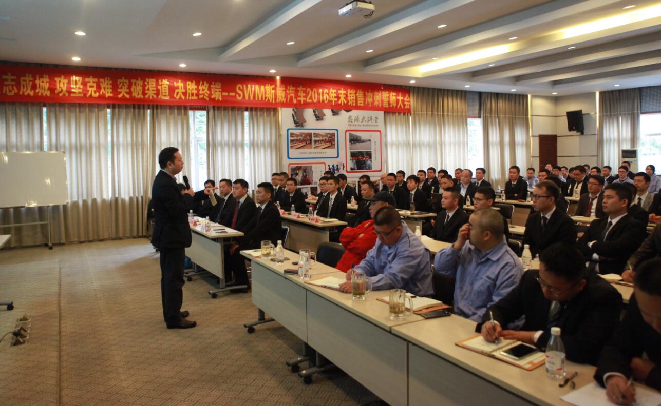目標的完成當然是離不開我們不斷的學習與總結。在10月29日SWM斯威汽車2016年末銷售沖刺誓師大會召開之前,SWM斯威品牌事業部12個大區的大區及區域經理就渠道建設、銷售管理、品牌傳播、市場推廣、1.5T產品的賣點及相關傳播策略等方面進行了為期三天的學習與交流。駐外人員與駐內人員就以上方面前期的工作進行了梳理,對日常工作的常見問題進行了溝通,對后期的工作進行了安排。鑫源控股副總裁兼銷售公司總經理張洪巖先生全程參與了學習,現場與大家進行交流。通過三天的學習,所有人員對自己的工作都有了清晰的認識,同時也對以后的工作提出了新的要求,力爭在后期的工作中規避不足,通過我們每一個人的努力提升SWM斯威品牌的品牌形象。