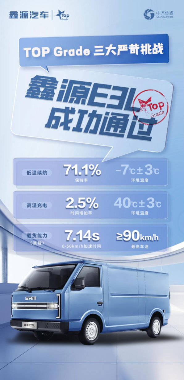 鑫源E3L在由行業(yè)權(quán)威機(jī)構(gòu)——中汽中心舉行的“2024Top Grade頂級品質(zhì)挑戰(zhàn)”極限測試中,在嚴(yán)苛的測試條件下成功通過“低溫續(xù)航、高溫充電和載貨能力”三種工況測試并取得優(yōu)異成績。鑫源E3L在低溫續(xù)航保持續(xù)率、高溫充電時間及滿載加速的多項(xiàng)測試中,均取得優(yōu)異的成績,這不僅得益于鑫源E3L優(yōu)異的性能,也是搭載新一代寧德時代電池的出色表現(xiàn)。