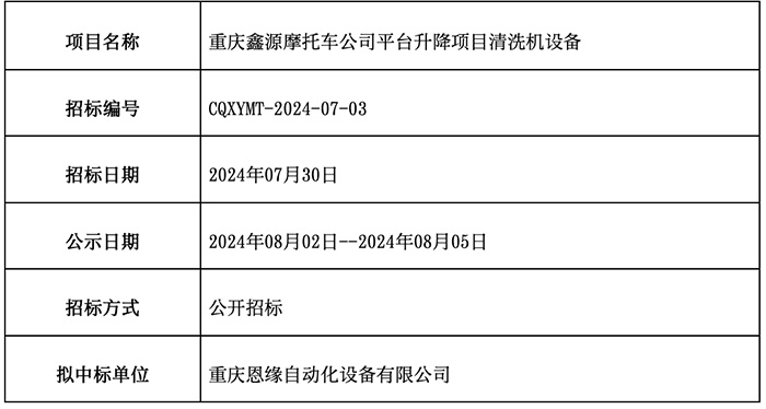 重慶鑫源摩托車公司平臺(tái)升級(jí)項(xiàng)目清洗機(jī)設(shè)備已完成招標(biāo)流程,現(xiàn)公示中標(biāo)結(jié)果如下: