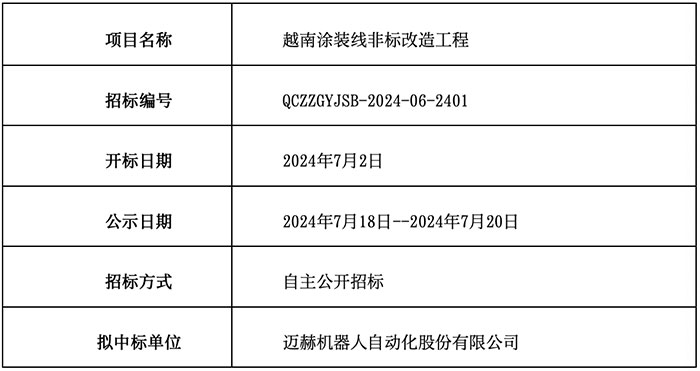 越南公司涂裝線非標(biāo)改造工程項(xiàng)目已完成開(kāi)評(píng)標(biāo)流程,現(xiàn)公示中標(biāo)結(jié)果如下: